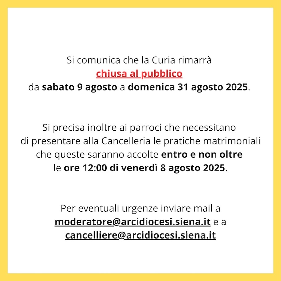 Mercoledì prossimo, 10 dicembre 2025, alle ore 20,30, nella Basilica di San Francesco a Siena si terrà l’Adorazione Eucaristica per…
