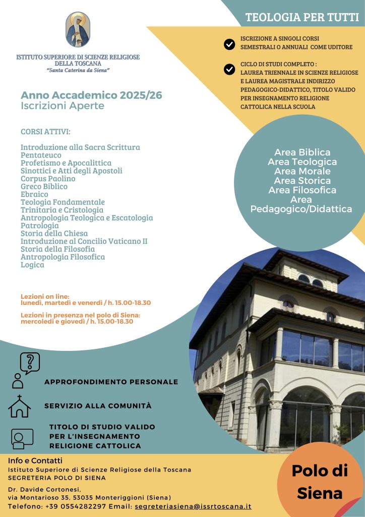 Sono aperte le iscrizioni per l’Anno Accademico 2025/26 dell’Istituto Superiore di Scienze Religiose della Toscana “Santa Caterina da Siena”, che offre singoli corsi (semestrali o annuali come uditori) o cicli di studi completi (Lauree triennali e magistrali con titoli validi per l’insegnamento della religione cattolica).