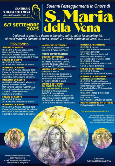 Sabato prossimo 6 settembre 2025, alle ore 19,30, presso il santuario S. Maria della Vena a Vena (Piedimonte Etneo – CT) il card. Augusto Paolo Lojudice, arcivescovo di Siena-Colle di Val D’Elsa-Montalcino e vescovo di Montepulciano- Chiusi-Pienza presiederà la Santa Messa in occasione dei solenni festeggiamenti in onore di Sana Maria della Vena.