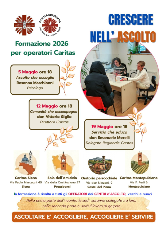 Prenderanno il via il prossimo 5 maggio 2026 i corsi di formazione per gli operatori delle Caritas di Siena-Colle di Val D’Elsa-Montalcino e di Montepulciano- Chiusi-Pienza. Il primo appuntamento è, dunque, il 5 maggio 2026 alle ore 18 e saranno collegate contemporaneamente on-line Siena, Poggibonsi, Castel del Piano e Montepulciano per la relazione su “Ascolto che accoglie” a cura di Rosanna Marchionni, psicologa. Nella prima parte dell’incontro le sedi sopracitate saranno collegate tra loro, poi, nella seconda parte di faranno lavori di gruppo.