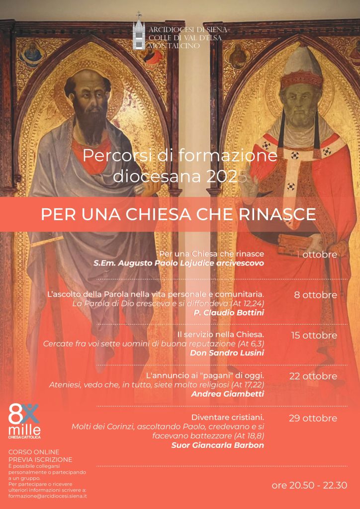 Si terrà domani sera il secondo appuntamento dei “Percorsi di formazione diocesana 2025″per l’arcidiocesi di Siena-Colle di Val D’Elsa-Montalcino e per la diocesi di Montepulciano-Chiusi-Pienza.