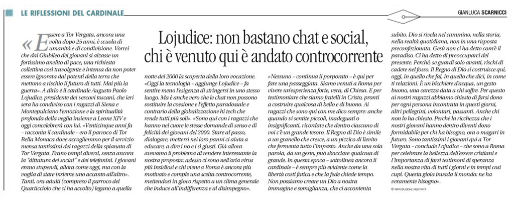 “Essere a Tor Vergata, ancora una volta dopo 25 anni, è scuola di umanità e di condivisione. Vorrei che dal Giubileo dei giovani si alzasse un fortissimo anelito di pace, una richiesta collettiva così travolgente e intensa da non poter essere ignorata dai potenti della terra che mettono a rischio il futuro di tutti. Mai più la guerra”. A dirlo è il cardinale Augusto Paolo Lojudice, presidente dei vescovi toscani che ieri sera ha condiviso con i ragazzi di Siena e Montepulciano l’emozione e la spiritualità profonda della veglia insieme al Santo Padre Leone XIV ed oggi concelebrerà con il Pontefice.