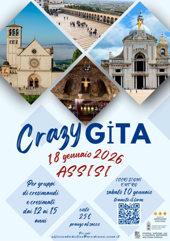 Il prossimo 18 gennaio 2026 torna la Crazygita, il pellegrinaggio diocesano pensato per i ragazzi tra i 12 e i 15 anni. In occasione degli ottocento anni dalla morte di S. Francesco torneremo ad Assisi.