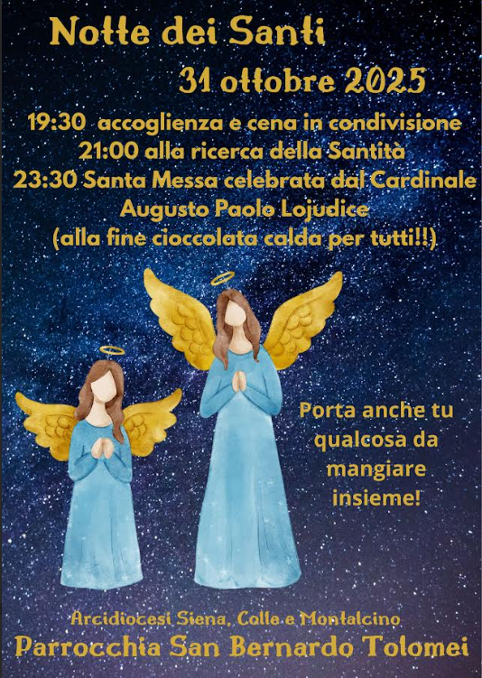 A Siena presso la parrocchia di  san Bernardo Tolomei con “La Notte dei Santi” che prevede alle ore 21 un momento di riflessione sul tema “Alla ricerca della santità” e alle ore 23,30 la Santa Messa presieduta dal Card. Augusto Paolo Lojudice.