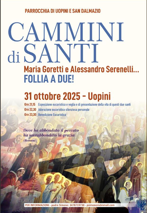 A Uopini (Monteriggioni) presso la parrocchia di Santi Marcellino ed Erasmo si terrà l’iniziativa “Cammini di santi. Maria Goretti e Alessandro Serenelli…”. Il programma prevede alle ore 21,15 l’esposizione Eucaristica e la veglia con la presentazione della vita dei due santi. Alle ore 22,30 l’Adorazione Eucaristica silenziosa e personale. Alle ore 23,30 la benedizione Eucaristica.