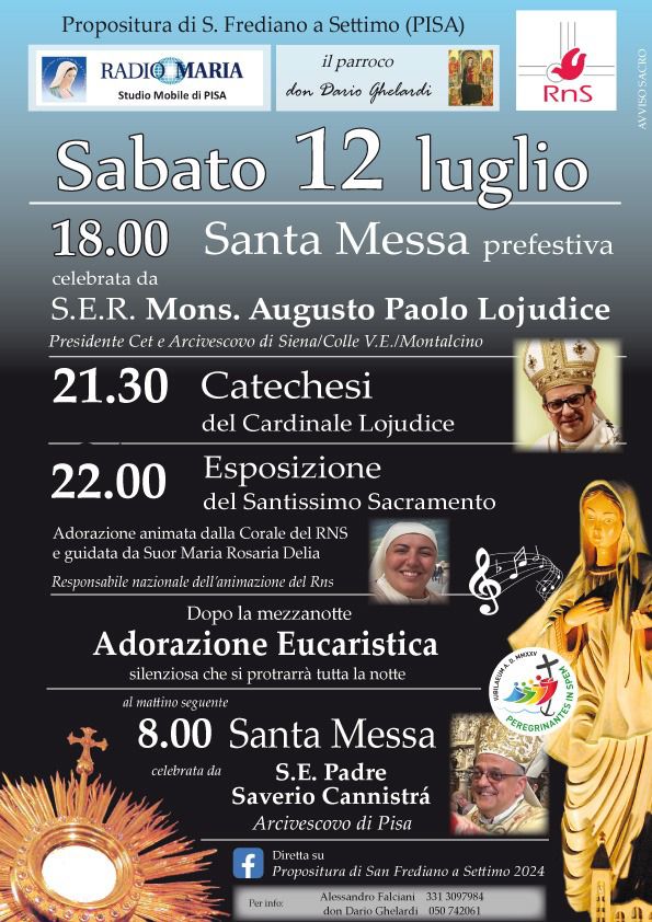 Sabato prossimo, 12 luglio 2025, alle ore 18, presso la Propositura di S. Frediano a Settimo (Pisa), il Card. Augusto Paolo Lojudice, presidente della Conferenza Episcopale Toscana presidierà la Santa Messa.
