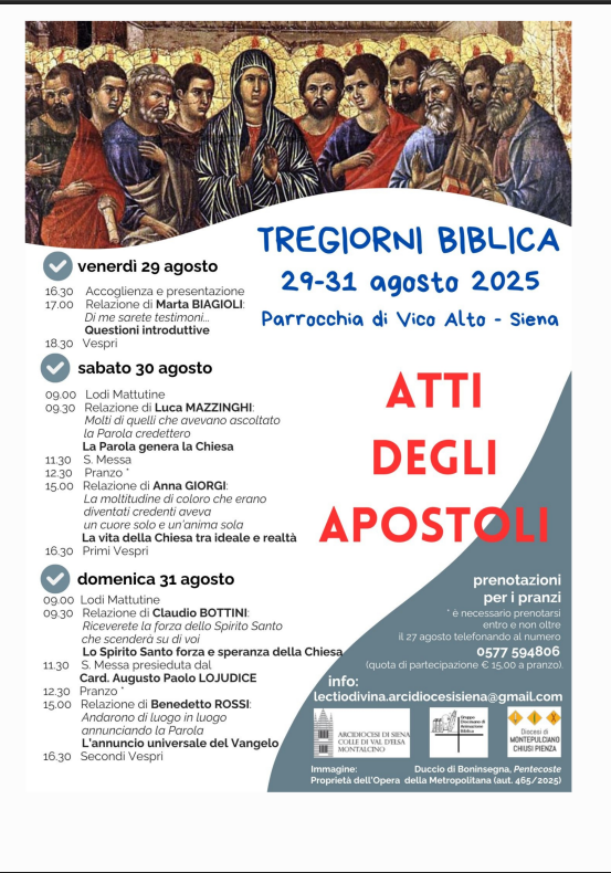 Dal 29 al 31 agosto 2025 si terrà il tradizionale appuntamento della “Tre Giorni Biblica” presso la parrocchia di Vico Alto a Siena.