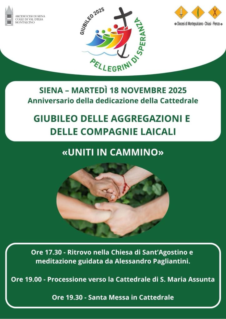 Ritrovo alle ore 18 presso la Chiesa della Santissima Annunziata, dove ogni coro è chiamato a cantare un brano di musica sacra a sua scelta; il testo del brano costituirà la riflessione iniziale e la preghiera tipica del pellegrinaggio giubilare. Al termine, processione verso il Duomo per la partecipazione alla S. Messa. A ogni corale sarà affidato un brano durante la celebrazione, mentre, alla fine, tutte insieme eseguiranno l’inno del Giubileo. - Giubileo delle Aggregazioni e delle Compagnie Laicali