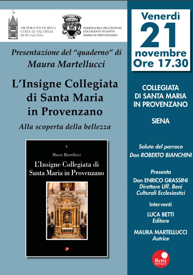 Venerdì prossimo 21 novembre 2025, alle ore 17,30, presso la Collegiata di Santa Maria in Provenzano a Siena, si terrà la presentazione del libro “L’insegne Collegiata di Santa Maria in Provenzano. Alla scoperta della bellezza” di Maura Martellucci.