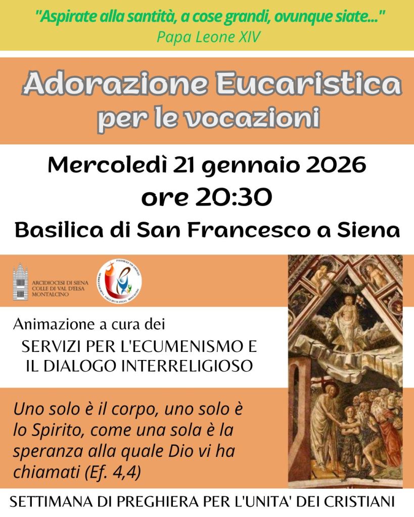 Mercoledì 21 gennaio 2026, alle ore 20,30, presso la Basilica di S. Francesco a Siena, si terrà L’Adorazione Eucaristica per le vocazioni.