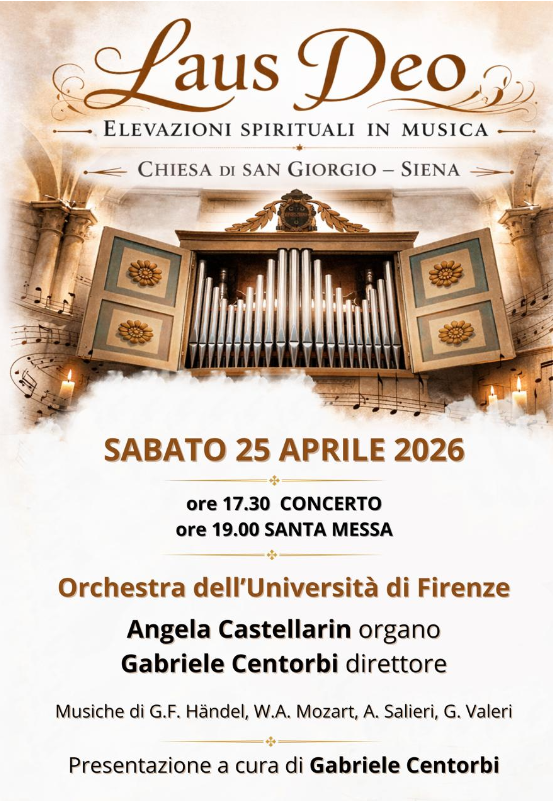Sabato prossimo, 25 aprile 2026, alle ore 17,30, si terrà il nuovo appuntamento della rassegna “Laus Deo, Elevazioni spirituali in musica”, che si terrà nella chiesa di San Giorgio in Pantaneto a Siena.