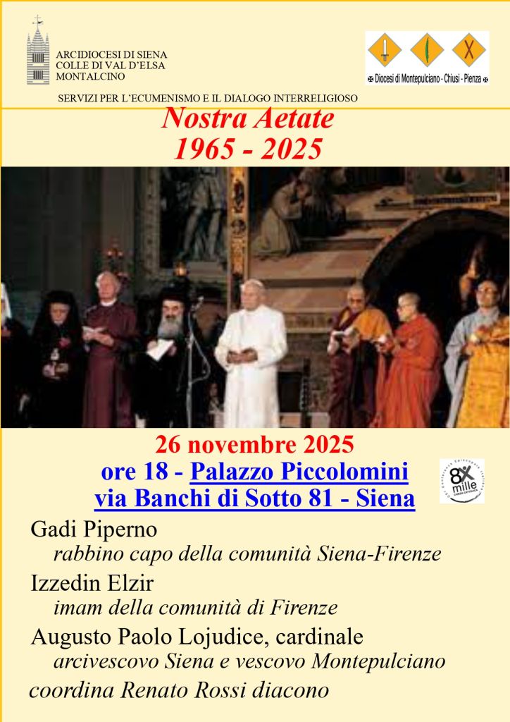 Domani, mercoledì 26 novembre 2025, alle ore 18, presso Palazzo Piccolomini in Banchi di Sotto, 81 a Siena si terrà l’incontro sulla “Nostra Aetate 1965-2025”. A 60 anni dalla pubblicazione di questo importantissimo documento del Concilio Ecumenico Vaticano II si confronteranno il card. Augusto Paolo Lojudice, arcivescovo di Siena-Colle di Val D’Elsa-Montalcino e vescovo di Montepulciano-Chiusi-Pienza, Gadi Piperno, Rabbino Capo di Firenze, Izzedin Elzir, Imam della comunità di Firenze. Coordina il diacono, Renato Rossi.