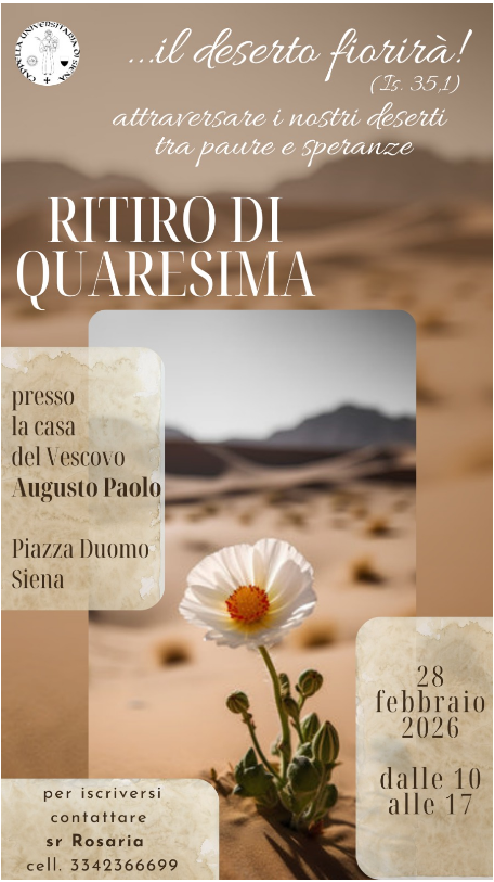 L’incontro, promosso dalla Cappella Universitaria di Siena, ha come titolo “…il deserto fiorirà (Is 35.1) Attraversare i nostri deserti tra paure e speranze”.