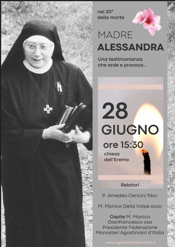 Sabato prossimo, 28 giugno 2025, alle ore 15,30, nella chiesa dell’Eremo di Lecceto (Siena), verrà ricordata la figura di Madre Alessandra Macajone nel XX anniversario della su scomparsa.