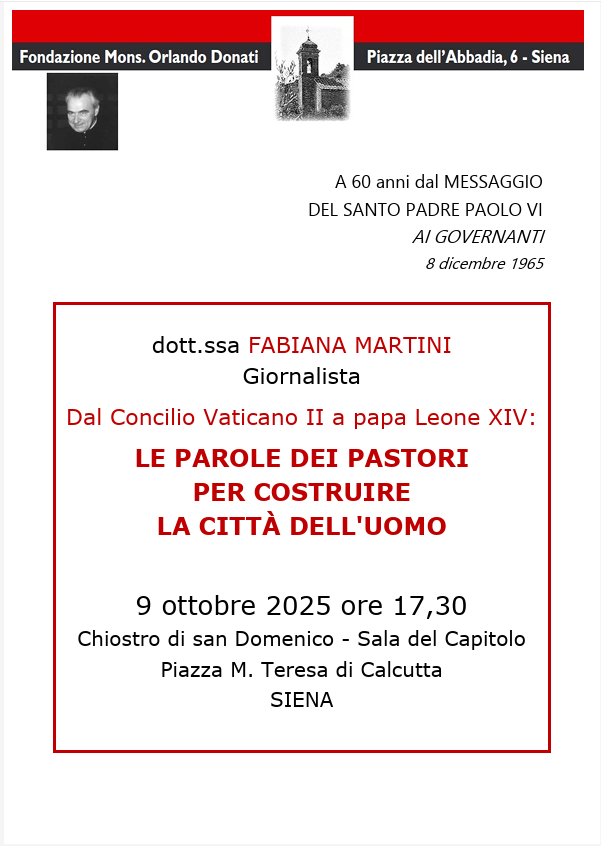 Giovedì prossimo, 9 ottobre 2025, alle ore 17,30, presso il chiostro di San Domenico, sala del Capitolo, in piazza Madre Teresa di Calcutta a Siena, si terrà l’incontro su “Dal Concilio Vaticano IIa Papa Leone XIV: le parole dei pastori per ricostruire la città dell’uomo” con la giornalista, Fabiana Martini.