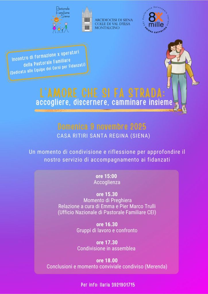 Domenica prossima, 9 novembre 2025, presso la casa Ritiri di Santa Regina a Siena dalle ore 15 si terrà l”incontro per gli operatori di Pastorale Familiare.